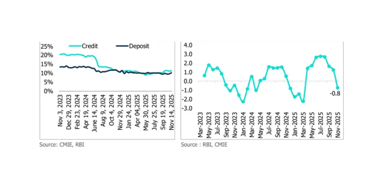 Bank credit growth continued to outpace deposit growth as of mid-November, rising 11.4% year-on-year, supported by GST rate cuts, resilient retail and MSME borrowing, and renewed corporate credit demand amid high bond yields. Deposits grew 10.2%, with some shift of household funds toward higher-return alternative investments.