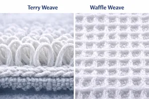 Terry towels are characterised by looped pile structures on one or both sides, produced using extra warp yarns. Longer and denser loops enhance absorbency. Waffle towels, on the other hand, feature a honeycomb structure that offers good absorbency with faster drying and a lighter feel.