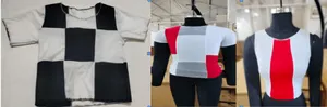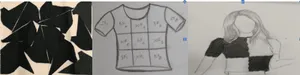 Following the weighing of the collected knitted fabric waste, we proceeded with a comprehensive shape assessment of the materials. This assessment involved a meticulous examination of the various shapes, sizes, and forms of the fabric waste. By categorizing the waste based on its shape characteristics, we gained valuable insights into how these materials can be best repurposed and upcycled. Understanding the different shapes within the waste stream allows us to make informed decisions regarding the design and manufacturing processes for upcycled products, ensuring optimal utilization of these resources. This shape assessment serves as a critical foundation for our work, enabling us to tailor our upcycling techniques to the specific characteristics of the fabric waste and how well we can utilize it to make an appealing garment. Firstly the cut waste was collected in an irregular polygon shape which was further developed into a 2d rectangular form for shape assessment. Figure 2 shows the shape assessment and theme creation of the cut waste. Once done with shape assessment we progressed in creating the theme of the garment. We choose to give the garment a chessboard theme with white and black/red fabric.