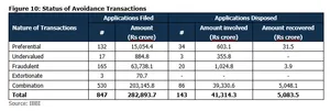 As per figure 10, RPs have filed 847 applications for avoidance transactions amounting to approximately Rs 2.8 lakh crore. Of these, only 143 transactions involving over Rs 41,300 crore (approximately 14.6% of the amount involved) were disposed of and only Rs 5,083.5 crore (12.3% of the amount disposed) have been recovered. Further, in one case 758 acres of land out of 858 acres which was earlier valued at Rs. 5,500 crore has been transferred; hence proportionate value has been considered.