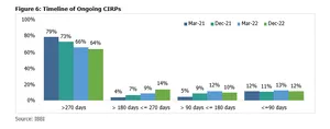 Of the 2,000 going ongoing CIRPs, there has been a delay of more than 270 days for the completion of the process of 64% of ongoing CIRPs in December 2022 which is a decline of 9% as compared to 73% in December 2021. Further, we can observe that the ‘more than 180 days but less than 270 days’ segment is the second largest indicating that quite a few cases which had commenced in the earlier quarters have piled up, while the other two categories continue to have quite a few cases in them highlighting the significant delays in the process.