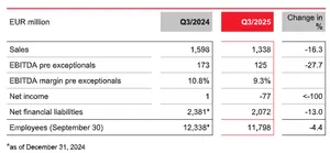 The company’s revenue declined by 16.3% year-on-year to EUR 1.34 billion, down from EUR 1.6 billion in the same period last year. EBITDA pre-exceptionals fell 27.7% to EUR 125 million, mainly due to reduced sales volumes and the absence of contributions from the Urethane Systems business, which was sold on April 1, 2025. Unfavorable exchange rates also added pressure to profitability. The EBITDA margin pre-exceptionals stood at 9.3%, compared to 10.8% in Q3 2024.