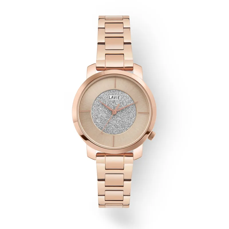 Luna: Radiate sophistication with a Rose Gold Dial and Silver Detailing. Venus: Embrace nature's elegance with a Leaf Patterned Dial. Iris Classic: Capture timeless beauty with a White Dial adorned with a Flower Pattern. Grace: Add a touch of glamor to your life with the Shimmer Dial. Elisa: Showcase confidence and style with a Black Dial and a Rose Gold Belt. Each watch is carefully crafted, seamlessly blending timeless aesthetics with modern functionality. Packaged in Lavie's signature chic light pink box featuring gold-foiled letters, these watches are a testament to Lavie's commitment to elegance.