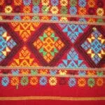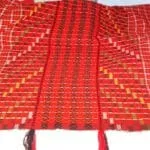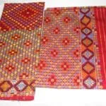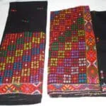 Dyeing The use of wealth of colours in handloom products is a unique feature of the textile tradition of Assam. The dyeing is mostly done with indigenous dye stuffs, mostly from barks, leaves, roots etc. The common types of natural mordants like common salt, silica (Terminalina citrine) were used The natural dyes like Lac (Cocus lacca), Achugach (Morinda augustifolia), Halodhi (Cucurma longa), tepor (Garcinia Xanthocymus) etc are also used. But now, the Mishing women also use vat or synthetic dyes for dyeing. Prior to dyeing, first they desized the yarns and remove excess dyes by boiling them in water or by immersing them in for water whole night and then dry sunlight. The dyed yarns then undergoes for the other process like winding and bobbining i.e, preparation for warping in loom. This is done with the help of a winding machine called Cheriki and ugha by using jotor (Charkha). Types of Loom used The Mishing community uses two types of looms. The Loin loom and Throw shuttle loom. Now they use Fly Shuttle loom, Jaccquard loom, Dobby loom and in some industries among Mishing community the power loom is also found to be in used. Gadoos a type of blanket are woven in loin loom. Loin loom is also mused to weave bags pillow covers etc. This looms is very simple, portable and convenient to erect and dismantle. The compact texture of the cloth woven and its intricate design are the most important factors for which the loin loom has still not lost its popularity. It is a part and parcel of the tribal textile tradition. The loom has no frame or upper structure, but it consists of two vertical bamboo poles kept horizontally. A few pieces of stout bamboo and wooden rods of varying thickness with a wooden beating sword is used as accessories of the loom. The throw shuttle loom is the most common and traditional loom used by all communities in Assam. A crude type throw shuttle loom has been found among Mishing tribe, four wooden posts required for the loom are fixed firmly on the ground. The beam and wrap are set to the frame just above the ground level. The weaver sits on the bench attached towards the wrap-beam to operate the treadles, but no weaving belt is used as in case of loin loom. This loom is found comfortable compared to contemporary loin loom. However, being a traditional loom, it is highly valued by the Mishing’s and they still use it. Deep cultural significance is attached to this loom and its inheritance passes to her daughter. The accessories required for the existing throw shuttle loom are very simple and can easily be made out of indigenous materials, mostly bamboo and wood. As such, it is easily accessible to the rural folk of Assam. The other parts of the loom are the wrap and cloth beams, reed, treadles, temple, shuttle, etc. Adoption of new technology and use of improved looms in household weaving is still rare in Assam especially among Mishing tribe. The archaic type of loom cannot be the basis for commercial production. Motifs and designs Nature played a vital role in inspiring the folk and tribal artisans to reproduce its many beauties in their crafts. The handloom fabrics of Assam are noted for their various indigenous artistic designs. The ornamentation is done on the loom itself. The designs are brought out by means of employing an additional layer of dyed yarns based on the ground materials. These extra yarns for design normally float over the main interlocking of warp and weft. This traditional technique is called the extra weft technique. Not only the motifs and designs, colours too play a vital role in the textile tradition of Mishing tribe of Assam. The indigenous design of the Mishings is called Ghai- yamik designs. These depict the excellent capability of Mishing weavers to arrange different geometric forms in a rich borders design. The Tapum Ege (Eri Shawl) and Pe-Charpi-pekok are good example of traditional items which is very intricate designs are used. These are highly cherished item in the respective tribal communities. Ege is another costume worn by women to cover the lower part of the body from waist to the ankle. The most common colour used is black. On the black base ornamentation are done yellow, red, and white. The traditional designs is named as Ghai yamik small buties named punjer symbolizing star, deer, horse butterfly etc. are arranged in geometrical order above the main border design. This depicts the excellent capability of Mishings weavers to arrange different geometric forms in a rich border design.