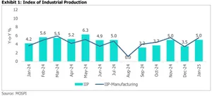 India's industrial production grew to 5% in January, up from 3.5% the previous month. Manufacturing and mining output accelerated, supporting the overall IIP growth. On the other hand, electricity output slowed in January. In terms of consumption, the output of consumer durables demonstrated an encouraging performance, whereas non durables continued to experience contraction. Overall, a broad-based and sustained improvement in the consumption scenario remains critical for the industrial performance.