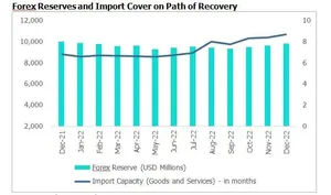 With the rise in remittances income, Nepal's foreign exchange reserves increased by 2% (m-o-m) to USD 9.8 billion in the month that ended mid-December and remained 2% higher when compared with pre-pandemic level (December 2019). The current level of forex reserve is sufficient to cover imports of goods and services for 8.7 months (higher than the target of 7 months). However, it remained less when compared to average import cover of 12.4 months in 2020/21.