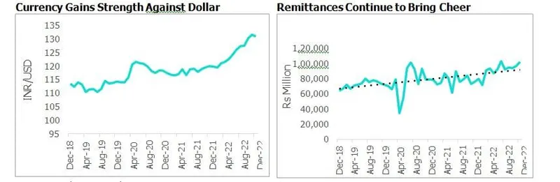 Reduced trade deficit and robust remittance inflows continue to provide cushion to the overall balance of payments. Remittances continue to record healthy growth and stood almost 42% higher when compared to pre-pandemic period of November 2019. The rise in remittance earnings has been attributed to an increased number of Nepalis going abroad for work opportunities. Nepalese currency also strengthened by 50 basis points against US dollar in mid-December 2022 from the previous month. Foreign direct investment continues to remain anaemic, as FDI flows stood at USD 18.7 million from mid-July to mid-December, almost 70% less in the current fiscal year compared to the same period last year.