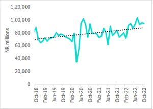 The decline in trade deficit and improved remittance inflows have helped in improving the overall Balance of Payments. Remittances continue to register double-digit growth for the fifth consecutive month in October 2022. Moreover, it also remained 23% above compared with the pre-pandemic period of October 2019. However, a weaker Nepalese rupee continues to pose challenges to the country’s external balance, inflation, and foreign debt.