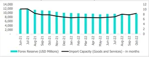 Nepal's foreign exchange reserves increased by 1.4% (m-o-m) to USD 9.5 billion in the month that ended mid October but remained almost 25% less when compared with pre-pandemic level (October 2019). The current level of forex reserve is sufficient to cover imports of goods and services for 8.3 months (higher than the target of 7 months). However, it remained less when compared to average import cover of 12.4 months in 2020/21. The healthy growth in tourist arrivals is encouraging development which is expected to have a positive impact on foreign exchange reserves.
