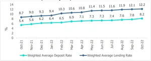 The weighted average lending increased to 12.2% in October from 8.7% a year ago. During the same period, the weighted average deposit rate has gone up by more than two percentage points to 8.2% in the month ended mid October 2022. Higher deposit rates will continue to attract deposits amid the ongoing liquidity crunch, but higher lending rates could put pressure on credit demand in the economy and dampen the investor’s sentiment.