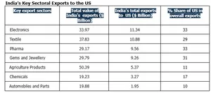 - During FY24, India’s aggregate merchandise exports to the US stood at $77.5 billion compared to our imports from the US at $42.2 billion. Out of India’s total exports to the US, the sectors in descending order of value are Electronics, Textiles, Pharmaceuticals, Gems and Jewellery, Agricultural products, Chemicals and Automobiles and parts.