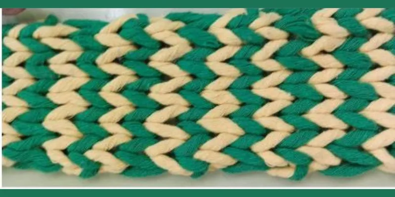 STEP 4: The old green loop is taken over yellow and passed behind the peg, leaving a new yellow loop on the stem of the peg, as seen in Fig.5. Fig.5. In machine knitting terminology, this action is known as knock-over or cast-off. Immediately after knock-over, the newly formed yellow loop is pulled through the old green loop for the appropriate loop length, as given in Fig.6. STEP 5: The first course is completed by knitting loops sequentially, one after the other, as presented in Fig.7. Therefore, this method is a sequential or individual knitting system. Now, the frame is ready to start with the formation of the second course. Fig.7 Now, the green yarn is fed to all pegs, and old loops of yellow yarn are ready to knock over at all the pegs sequentially for the formation of a new course, as observed in Fig. 8. Fig.8 Alternate feeding and knock over of both yarns will continue for the production of the entire length of the fabric. Fig.9 During knitting, green has fed and cast off the process of previously formed yellow loops are continued. Fig.10 Formation of the yellow course is being completed with the knock-over process at the last peg. Fig.11 Technical back of long fabric being Fig.12.Technical face knitted is seen with a curling tendency (legs of loops in “V” formation) at selvedges. Fig.13 Loop diagram derived from the technical face of the fabric as given in Fig. 12. Fig.14 Technical back (Head and feet of lopes in the form of opposed semi-circles). Fig.15. Loop diagram derived from the technical back of the fabric, as shown in Fig. 14. Result and Discussion: