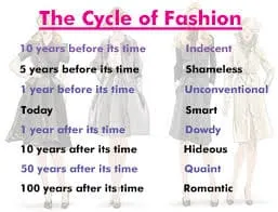 Understanding the cycles of fashion is important. Consumers are exposed each season to a multitude of new styles created by fashion designers. Some are rejected immediately by the press or by the buyer on the retail level, but others are accepted for a time, as demonstrated by consumers purchasing and wearing them. Fashion cycle The way in which fashion changes is usually described as a fashion cycle. It is difficult to categorize or theorize about fashion without oversimplifying. Even so, the fashion cycle is usually depicted as a bell-shaped curve encompassing five stages. The cycle can reflect the acceptance of a single style from one designer or a general style such as the miniskirt. Fashion cycle simply means the way in which fashion changes. Five stages are as follows: