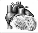The Cardiac Support System (CSD) is a warp-knitted elastic mesh bag that is cut and sewn to the heart's form. The basic structure is the Atlas stitch, and the material is a multi-filamentous yarn that offers high strength and fatigue resistance while remaining flexible. The glossy fabric with warp-knitted atlas stitch is easy to slip on the surface of the heart for acute wall support.