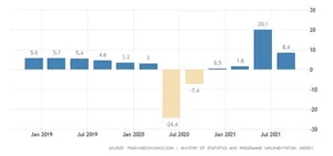 [4] GDP:India's economy expanded by 8.4 percent year-on-year in July-September 2021, following a record 20.1 percent growth in the previous three-month period and matching market expectations. The reading marked a fourth straight quarter of expansion, as Coronavirus-related disruptions continued to ease and as the economic activity rebounded helped by a faster pace of vaccinations and a drop in cases. By sectors, service activity growth was supported by increases in trade, hotels, transport & communication (8.2% vs 34.3%), financial, real estate & professional services (7.8% vs 3.7%), and public administration, defence& other services (17.4% vs 5.8%). In addition, output rose for manufacturing (5.5% vs 49.6%), mining & quarrying (15.4% vs 18.6%), utilities (8.9% vs 14.3%), construction (7.5% vs 68.3%), and agriculture (4.5%, the same as in July-September). The Reserve Bank of India has forecast an annual growth of 9.5 percent in the current fiscal year. source: (3) Ministry of Statistics and Programme Implementation (MOSPI).