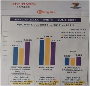 [9] ITF Times23shows in Q1, 21, the Export has gone up by 42% comparison to Cotton yarn,fabrics,Garments (Made up), H.L.Products( High quality fabrics, Industrial Fabrics, Technical Textile , Speciality fabrics etc) in comparison to Q1, 19 and that of Q1, 18. Similarly % of Exports has also increased by 18% in Q1, 21, comparison to Q1 , 19 and that of 18 too in case of Manmade Yarns, Fabrics and Made ups. Please refer Figure 3.