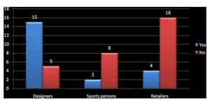 42% of total respondents (50) were aware of bamboo knits however 58% of the respondents were not aware. 30% of the total respondents (designers) were aware of bamboo fabrics whereas only 4% of the respondents (sports persons) and 8% of respondents (retailers) were aware of bamboo fabric.