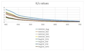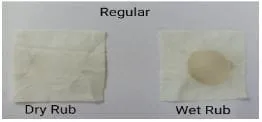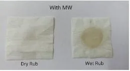Figure – 10 RESULTS AND DISCUSSION The result of the experiment shows that natural dyes extracted using the microwave assisted soxhlet extraction is effective and efficient in getting an higher yield, in shorter time using less energy consumption and less needed solvents, this extraction method suits very well for solid liquid extraction in plants (Rastrelli L et al. (2018)), (Ingrath W et al., (2015)). This sizable concentration of brown pigment extracted from seaweed (Figure 3,4) which have been easily dyed on cotton fabric in a continuous form using the ultra-rapid dyeing method. By using the ferrous mordant dark shades are possible with overall good fastness properties. The carotenoid (fucoxanthin) in the dye pigments gives the dark brown and golden brown color (Wiraningtyas et al., (2018))and also a permanent brown shade to the cotton fabric with better wash fastness as shown in figure 5,6,7,8. The function of K/S is directly proportional to the concentration of colorant in the substrate. High K/S values (Figure 13) shows a higher amount of dyestuff in the fabric resulting in deeper shade as seen in the case of microwave assisted solvent extracted sample. Similar graph trends indicate that the dyes are from the same source. From the color measurement readings as given in figure 11 we can find that the depth of shade is darker in the microwave assisted solvent extraction dyed sample. Also in further washes the shade retains more in microwave assisted solvent extraction dyed sample. Rubbing fastness of the dyed material is also at par with the industry standards as in figure 9,10. To summarize the findings figure 12 shows the gray scale readings of the samples. Due to the unique process of ultra-rapid dyeing where the fabric is pad nip dried and cured resulting in no effluent generation throughout the process. Seaweed natural Dyeing is done using natural materials only in neutral pH hence no after wash is done. Thus making the product and the process completely sustainable.