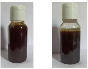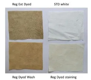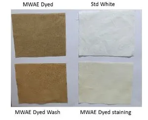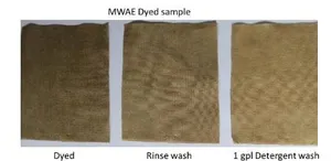 Figure - 3. Figure - 4 Figure 3 shows the extract from microwave assisted solvent extraction and figure 4 shows extract from regular solvent extraction. Ultra-rapid natural dyeing Both the extracts were taken for dyeing separately. RFD Cotton fabric sample with less than 3 sec absorbency was taken for dyeing. For dyeing, the previously extracted solution was taken in the padding trough. To achieve fastness properties simultaneous mordanting and dyeing was carried out, here the mordant forms a coordination complex with the dye and aids the attachment of dye onto the fabric. There are various mordants available such as alum, tannic acid, stannous chloride, copper sulfate, ferrous sulfate etc. In this case the mordant used was ferrous sulfate to get dark shade and better fastness properties. 20 gpl of ferrous sulfate was used in dyeing. Dyeing was carried out in the ultra-rapid dyeing machine where the fabric was dipped through a physio-acoustic applicator containing dye and mordant solution at room temperature and squeezed through the padding mangle followed by drying at 90 degree c and curing at 150 degree c. pH of the dyeing solution throughout the process was 7. Thus both the dyed fabric were rinse washed for further testing and analysis. Color Measurement and Color Coordinates The natural dyed fabrics were measured and examined for color strength (K/S) and color reflectance by spectrophotometer. The K/S value is the value used to measure the strength of absorbency. The depth of color of the dyed fabric was determined by analyzing the K/S value of a given dyed sample. The dyed sample were analyzed and expressed in terms of their L* a* b* values. The L* values designate perceived lightness or darkness. Value of 0 indicates black and 100 defines white. The values of a* indicate redness (+a) or greenness (-a), while value of b* shows yellowness (+b) or blueness (-b). Color Fastness Properties Color fastness is the resistance of a material to change any of its color characteristics or extent of transfer of its colorants to adjacent white materials in touch. The color fastness is usually rated either by loss of depth of color in the original sample or it is also expressed by staining scale. However, among all types of color fastness, light fastness, wash fastness and rub fastness are considered general for any textiles. Meanwhile, perspiration fastness is considered specific for certain apparels (Samanta, A. K. et al.,(2009)). In this trial, color fastness of dyed fabric was analyzed in terms of washing fastness and rubbing/crocking fastness. All methods were carried out in accordance with Standard adopted from ISO Standard. All samples were graded from scale 1(the worst) to 5 (the best) as indicated by AATCC. The summary of the tests is given in figure 12. These scale were used to assess color change and to measure the staining amount referral to undyed fabrics during fastness tests. Color Fastness to Washing Color fastness to washing was determined using standard ISO 105-A05-200 3 test method. A sandwiched sample of size 10 cm x 4 cm was prepared for every dyed fabric. Then, a soap solution with liquor ratio 1:50 was prepared according to the respective weight of the sandwiched sample. All sandwiched samples were soaked in the soap solution in a vessel and rotated for 30 minutes at 60°C.. After completion of process the samples were air dried followed by evaluation on the color changes using the standard grey scale under the lighting cabinet as noted in figure 12.