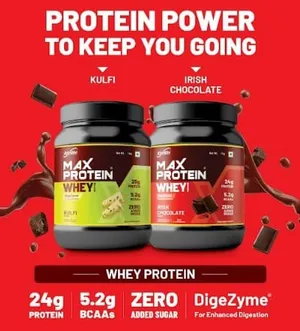 Max Protein Whey Protein debuts in two indulgent flavors - Irish Chocolate and Kulfi, crafted to tantalize your taste buds while delivering unmatched nutrition. Each serving packs a potent 24g of protein and 5.2g of Branched-Chain Amino Acids (BCAAs) to support muscle recovery and growth. It boasts Zero Added Sugar, making it a guilt-free choice, and features DigeZyme for enhanced digestion, all while being Gluten-Free.