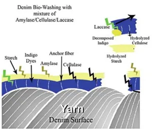 Many researchers and scientists are working on the electrochemical reduction of indigo dyes. They have studied electrochemical reduction of indigo dyes with the help of ultrasonics, to provide water-soluble indigo dyes in an eco-friendly manner, using an aqueous system during production. The reduction potential can increase with increasing pH, which means that mass transfer is better with increasing pH. The use of ultrasound in the process helps with the reduction of particle size. This is a green and eco-friendly technology, which offers many advantages over the conventional (chemical) reduction technique. Lower cost, greater energy efficiency, and no need for use of Na2S2O4 and NaOH are some of the advantages. This is a very novel route for environmentally friendly and sustainable indigo dyeing. 2.3. Stone Washing Pumice stones are commonly used in stone washing. Pumice is a lightweight, highly porous, rocky substance, which can float on water due to its porosity. It is a product of volcanic eruptions. During stone washing, the fibers on the surface layer of the fabric are broken and hence removed, and the inner white fibers of the warp yarn, commonly known as “ring dyeing,” are gradually exposed. 2.4. Eco friendly Enzyme Washing Technique With consideration of environmental factors and efficiency, various eco-friendly enzymes have come into the picture of denim processing. Chemically an enzyme is defined as a protein complex composing near about 200–250 amino acids. Enzymes can bring hydrolysis, oxidation, reduction, coagulation, and decomposition simultaneously, although the most common reaction among all is hydrolysis. Enzymes accelerate reactions, they act only on specific substrates, operate under mild conditions, easy to control, and are also biodegradable. Because of these special characteristics, enzymes are used extensively in denim processing. In the traditional stone washing process, denim color used to get faded by the abrasive action of pumice stones on the fabric to give a worn-out appearance. In bio stoning finishing, cellulase enzyme is used to accelerate the abrasive process and, in this process, the cellulase works by reducing the indigo dye on the denim surface. This enzymatic process offers a lesser pollution load and better ease of treatment in effluent plants.