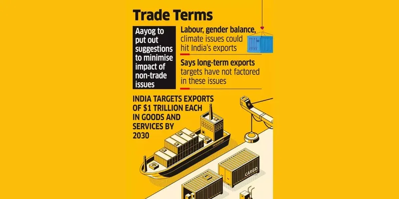 The government is evaluating how well-prepared the nation is to deal with the effects of non-trade-related concerns including labour, gender equality, deforestation, climate change, and sustainable development that many countries are using to impose restrictions or higher export tariffs. A senior government source told ET that the NITI Aayog is thoroughly examining these challenges and their consequences for exports and will shortly tighten up its suggestions to ensure India maintains its export development pace. By 2030, India wants to export $1 trillion worth of goods and services combined. The goal is to increase the nation's current 2.1% export share of global trade to 3% by 2027 and 10% by 2047. The Aayog believes that these aims do not take into account the impact of non-trade-related concerns, which are growing more and more significant. "Non-trade issues will become increasingly important moving forward, and the current set of export growth estimates is mostly dependent on demand for primary products and intermediates. Therefore, the Aayog would develop appropriate recommendations to reduce their impact, according to the official who wished to remain anonymous.