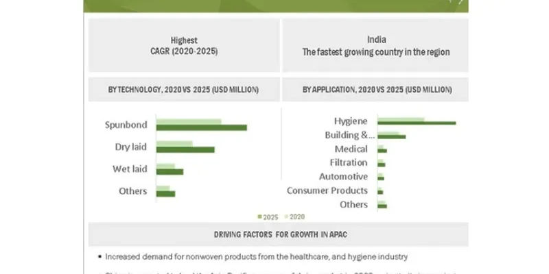 The report "Nonwoven Fabrics Market by Polymer Type, Layer, Function, Technology (Spunbond, Wetlaid, Drylaid), Application (Hygiene, Building & Construction, Filtration, Medical, Automotive, Consumer Products), and Region - Global Forecast To 2025", The global nonwoven fabrics market size is projected to grow from USD 40.5 billion in 2020 to USD 53.5 billion by 2025, at a CAGR of 5.7% from 2020 to 2025. The market is projected to grow in accordance with the increase in the demand for nonwoven fabrics for hygiene products across the globe. Factors such as an increase in the innovations in nonwovens, and a boost in the demand for hygiene and medical products during the COVID-19 pandemic is expected to drive the market for nonwoven fabrics. Download PDF Brochure Browse • 142 Market data Tables • 50 Figures • 211 Pages and in-depth TOC on "Nonwoven Fabrics Market - Global Forecast to 2025" Some of the prominent key players are: . Ahlstrom-Munksjo (Finland) · Berry Global Inc. (US) · Kimberly-Clark Corporation (US) · Asahi Kasei Corporation (Japan) · Toray Industries Inc. (Japan) · Freudenberg Group (Germany) · Lydall, Inc. (US) Opportunity: Proliferation of new technologies Technological enhancements have led the textile industry to witness high growth in most of its product segments, especially for nonwoven fabrics. New technologies are expected to bring down production costs, thereby rendering the manufacturing of nonwoven textile commercially feasible. Incorporation of nanofiber and high-performance material technologies are emerging as alternatives to traditional membranes creating new opportunities for nonwoven manufacturers. In terms of volume, spunbond are estimated to lead the nonwoven fabrics market in 2019. Spunbond, by technology, accounted for the largest market share in the nonwoven fabrics market. Spunbond is widely used for the processing of sustainable nonwovens, owing to its cost effectiveness and high performance, and yields higher output at comparatively lower costs. Increase in the use of spunbond nonwovens for baby diapers and geotextiles is expected to have a positive impact on the demand for spunbond nonwoven fabrics. Request Sample Pages The APAC region is projected to account for the largest share in the nonwoven fabrics market during the forecast period. The APAC region region is projected to lead the nonwoven fabrics market, in terms of both value and volume from 2020 to 2025. Higher domestic demand, along with the availability of low-cost labor, makes this region the most attractive market for nonwoven fabric producers. Hence, the market players are focusing on this region to gain a larger share and increase their profitability. Factors such as improving global economy, expanding working population, and rising domestic demand for hygiene products are expected to boost the market for nonwoven fabrics. About MarketsandMarkets™
