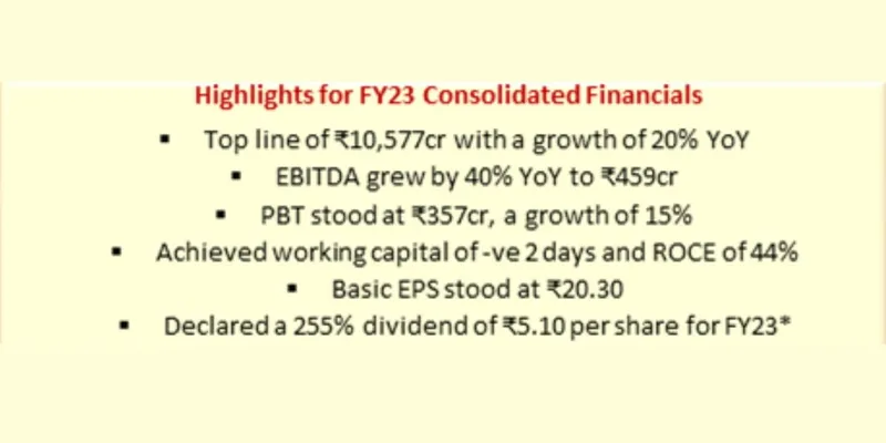 PDS has demonstrated strong, resilient growth with a topline of ₹10,577cr and a growth of 20% as compared to ₹8,828cr in FY22. The Company reported a Gross Margin of 16.7%. EBITDA increased by 40% to ₹459cr from ₹327cr in FY22, with FY23 margins of 4.3%. PAT stood at ₹327cr vs ₹293cr in FY22, registering a growth of 12%. In line with the dividend distribution policy, the Company has declared a 255% dividend of ₹5.10 per share, of which ₹2.50 was paid as an interim dividend. This translates into a payout of 25% on EPS.