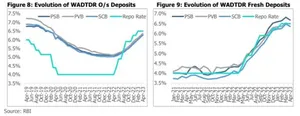 The figures on interest rates and borrower mix continue to show that the loan portfolio is moving to higher interest rate buckets compared to the rates that prevailed during the Covid pandemic. In the personal loans categories, lending rates have broadly caught up with the pre-pandemic levels, while the rates in other categories are yet to catch up with pre-Covid levels. Deposit Rates: Fresh Rates Fall in Line with Lending Rates, while O/s Rates Continue Upward March