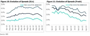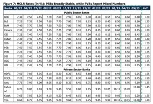 The spread of SCBs between WALR and WADTDR (the net interest rate spread) stood at 3.48% and 2.73% for Outstanding and Fresh rates, respectively in April 2023. The spread broadly narrowed in April 2023 as fresh lending rates fell faster than fresh deposit rates, while o/s deposit rates rose faster than o/s lending rates. On a y-o-y basis, PSB and PVB spreads narrowed, while the spreads of both PSB and PVBs have continued to remain elevated compared to the pre-pandemic levels. Additionally, the spread between Fresh WALR and WADTDR continues to be lower than the spread between Outstanding WALR and WADTDR. PVBs continue to maintain a higher spread given that they charge more as compared to PSBs. Conclusion In April 2023, fresh lending, as well as deposit rates, decreased, with lending rates dropping faster than deposit rates. On the other hand, interest rates on outstanding business continued to rise. Credit demand is lower at the beginning of the fiscal year, hence pressure on deposit rates has eased. The rise in rates seems to have been arrested for now at the end of May. The trajectory of rates on the deposit side will be shaped by the pace of credit offtake, hence we would need to observe the rates movement over the coming months to conclude if the rates have peaked or if further increases would continue. Private Sector Banks (PVB) and Public Sector Banks (PSB) have maintained high spreads between lending and deposit rates, with PVBs seeing higher spreads, as banks raised rates amid RBI’s tightening moves. Rate hikes and subsequent resets in lending rates vs. deposit rates have led to NIM expansion in the near term which was expected to be followed by NIMs staying stable with deposit rates climbing faster as lending rates stayed stable. The withdrawal of Rs. 2,000 banknotes is likely to boost short-term liquidity in the banking sector thereby reducing the pressure on deposit rates. The banks may use incremental deposits to increase credit growth. This is likely to reduce the pressure on NIMs.