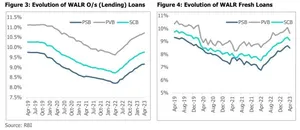 Credit demand has been recording double-digit growth driven by personal loans, increased working capital requirements, and NBFCs. Meanwhile, comparatively lower deposit mobilisation and pick-up in credit offtake have pushed the credit deposit ratio to nearly 75.4% as of May 05, 2023. The banking system liquidity surplus has narrowed from Rs 6.3 lakh crore at the start of FY23 and had turned into a shortfall near the end of FY23. Hence, liquidity had been injected into the system. Banking system liquidity turned to a surplus in April on account of government spending and RBI FX intervention. Liquidity infusion was somewhat offset by LTRO/TLTRO redemptions. To keep liquidity near neutral, RBI could continue conducting VRRR auctions. The short-term Weighted Average Call Rate (WACR) has reached 6.76% (as of May 12, 2023) from 4.06% as of May 13, 2022, due to a rise in policy rates and lower liquidity in the system. Lending Rates on Outstanding Portfolio Continue to Rise, while Fresh Rates Decline