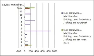 Machines for Knitting, Lace, Embroidery, Tufting in Germany was at US$12.63 million:2020 whereas in 2021: US$26.23 million i.e. 107.68%; in Taiwan in 2020 it was at US$13.95 million wherein in 2021 it raised up till 55.34% i.e. US$21.67 million; in Turkey in 2020 it was at US$0.67million whereas in 2021 it became US$ 6.64 million i.e. 891.04%; in Singapore in the year 2020 it was at US$0.82 million while in 2021 it increased by US$2.53 million i.e. 208.54% and in Italy in 2020 it was at US$1.02million while in 2021 it became US$4.48 million i.e. 339.22%.