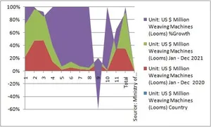 Weaving Machines (Looms) in China in 2020 it was at US$107.07 million and in 2021 it became US$242.54 million i.e. 126.52%; in Turkey in 2020 it was at US$2.38 million and in 2021 became US$4.42 million i.e. 85.71%; in UAE in 2020 it was at US$5.47 million whereas in 2021 it declined by US$3.52 million i.e. -35.65%; in the USA in 2020 was at US$3.36 million whereas in 2020 it grew by 164.29% i.e. US$8.88 million and in Hong Kong in the year 2020 it was at US$4.65 million and in 2021 it became US$8.15 million i.e. 75.27%.