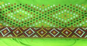 gra, Ghuri and Ijjar Like other part of India, the ghagra was a waist cloth used in different theatrical performance i.e. bhaona and band singers. Ghuri was a skirt like lower garment. Material used for ghuri is pat silk yarn. The sutradhara of Bhaona and Gayon Bayan or Yoja (the members of the band of singers and dancers) wore Ghuri. The dancer was called „Natua’ in the satras. The ordinary dancers who take participate in Bihu dance also used Ghuri. It is adorned with a border of floral design at the lower. Alongwith ghuri the Satriya dancer used Kanchi a waist gear. It is an accessory of the waist. It is made of three U-shaped pieces joined together by a band at the waist which is stitched to it. It is adorned with borders of floral designs.