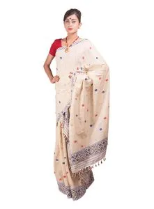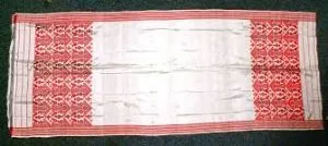 Riha / Augron It is a fairy thin cloth of approximately 3.25 x 0.70 metres size. Riha is a typical and traditional item of women attire. It is worn as a wrap around the upper part of the body usually beneath the chadar to cover the breast region. A part of the riha is tightly passed over the loin region and tied around the waist. Worn this way, the riha is supposed to tend to the shapeliness agility of the frame. In the olden days Assamese women did not use blouse and hence, riha was the formal breast cover. For most of the women riha is not part of everyday wear these days. Riha with its distinctive mode of wearing, makes the dress of an Assamese women graceful. It is an important item of bridal attire. It is also much valued as an item of dress of married women on ceremonial occasions. Riha is woven out of cotton, muga and pat. Rayon is also used occasionally with cotton. Riha is popularly called augron in Lower Assam. Khania It was a double folded wrapper having flowered border or golden thread (guna shutar phull) at the end of one fold, instead of cotton yarn. It was altogether 12 cubits in length and 3 cubits in breadth. The decorative works had been seen at the two ends of Khania cloth with muga and golden thread. Sometimes eri yarn was also used in making of this cloth. Designs with geometrical motifs, flowers, trees, creepers were woven with muga or golden thread as cross-borders. Small motifs also used as butis for additional ornamentations. In medieval age, the higher officials or high-ranking people, both male and female used Khania woven with silk yarn. The Khania used by female is called as “Pakhila Ura Kapor’, which used over riha instead of chadar at the time of social and religious occasion, (Barua Bhuyan 2003, p.24) it was a costume that the married Hindu women present one Khania bastra to the satra to her „Guru’ or God. This is required as a mark of respect for the Guru‟s or God. Such offerings are made on other occasions also. It is moreover, a piece of fabrics with distinctive status connotation. Traditionally it is considered most appropriate for a newly married girl to present a Khania-barkapor to her in-laws as a token of respect. Gamocha Gamocha is basically a textile item which is used to wipe the body and face. But it is a piece of cloth, having multiple uses and meanings. Gamocha is an indispensable part of Assamese life and culture, intricately and intimately woven into the social fabric of Assam. It is not merely an item of multipurpose physical convenience. Its services extend far beyond the body into the sphere of mind and soul (Das N.D). It has come to acquire distinctive symbolic significance in the non-tribal plains Assamese socio cultural life. In many rural Assamese homes, weaving of gamocha is a must even if the loom is not used for other textiles. The women also lavish considerable care and attention in weaving intricate designs along the cross borders of gamocha. Gamocha is woven out of mostly 40s, 60s cotton. Occasionally 2/80, or 2/100s Cotton are also used. It is woven invariably in white with red as side and cross borders. Floral designs are woven as cross border at one end. The other end is finished with a plain border of the same colour. Use of colours other than red in the boarders is often noted in lower Assam. The cultural importance of gamocha can easily be appreciated from the different names it has, one for each of its varied utilities.