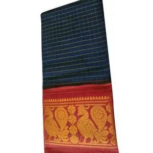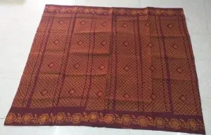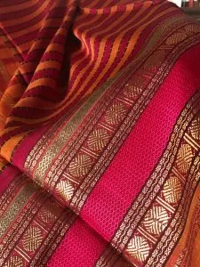 The saris were prepared in Kalakshetra to be used for Bharatnatyam dance form. This sari was promoted by Bharatnatyam dance maestro Rukmini Devi Arundale. The ‘Kalamkari Centre’ was set up at Kalakshetra by her to revitalise the ancient Indian craft of textile printing. Border and pallu of the sari are contrast. The pallu has vertical stripes whereas, border has geometrical, floral or temple design. The traditional motifs are Rudraksh, vanki, neli, diamond, star, salangai or manga butta. Adiyar sari’s weft yarns are tied-n-dyed in various colours is its main feature. Kovai Kora cotton sari