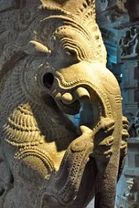 The Tanjore paintings are a hallmark of India’s rich cultural legacy. It has been recognized as a Geographical indication by the Government of India in 2007-08. Painted in vibrant shades embellished in colorful semi-precious stones, pearls, glass pieces and gold, they form some of the world’s masterpieces done on surfaces of wood, mica or ivory. The paintings also adorn the ornate pillars, elaborately decorated canopies and garlands of ropes and chandeliers. Common subjects were Gods and Goddesses, episodes from Hindu mythology; Fairs, ceremonies, processions and festivals; Castes, their occupations and dresses; Indian Flora and Fauna, etc. A wooden board is prepared. The paintings are done on a separate unbleached cloth and treated with a mixture of glue and chalk powder. Finally the drawing is traced on the board, followed by elaborate and exquisite embellishments and painted with an amalgam of chalk powder and gum Arabica to produce three dimensional stylized shading effects that is truly a sight to behold. Stone Icon Carving