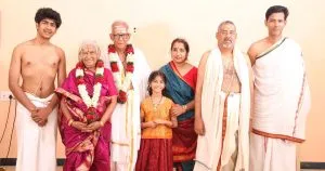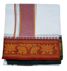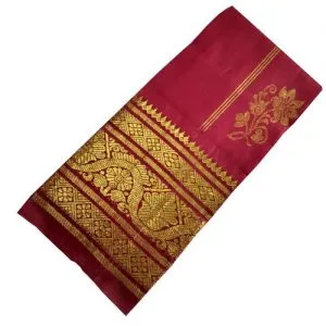 Tamil men wear a dhoti known as Vesti, Panchkattu or Panchgacchhe. Pleats in the back known as gochi and front as Kosavam. Right side long, pleated and tucked in front. Godakattu is the cloth wrapped around the waist and two ends are tied in front without formation of pleat. Paibatta is an angavastra used to cover upper body & tied at waist. They wear ‘Janoi’ a sacred thread on the left shoulder across the right hip and apply Naman with Vibhuti on forehead. Costume of women: