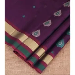 Kovai Kora cotton is a type of sari made in the Coimbatore region in Tamil Nadu, India. It has been recognized as a Geographical indication by the Government of India in 2014-15. Kovai Kora cotton is made from a blend of silk and cotton. A superior quality cotton yarn is mixed with traditional silk to produce kora cotton. The kora cotton sari has a kora silk warp and a cotton weft yarn. The sari has a self-designed jacquard all over. The saris have bright colored border designs with occasional use of shining zari. The required designs are weaved using the loom using combinations of colored cotton and silk threads and the borders are added later. Koorainadu and Kodambakkam saris