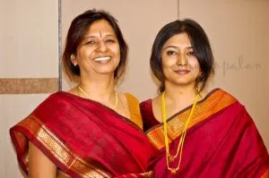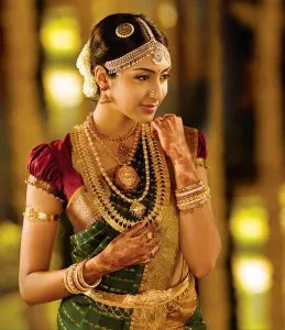 The sari is tied in the left then taken behind & drawn in the front from right side. Then pallu is taken on the right shoulder from right to left, and the length of the pallu is long till knee. The remaining sari is then pleated and tucked in front pleats known as ‘Kosava’. Pleats are then divided into half & tucked at the back under the pallu called ‘Paita’. The sari is worn above the ankle and the pallu is drawn from left armpit to the front, spread in the front and tucked at the back. End of the pallu is known as ‘talappu’. Iyengar women drape sari in a different way. The only difference is the pallu is taken on the left shoulder from left to right. Then it is drawn from right armpit to the front, spread in the front and tucked at the back. Ornaments: