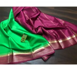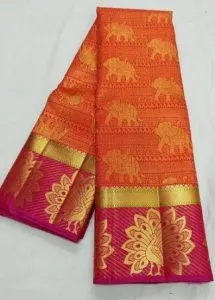 Fiber used is art silk. Its design is similar to Kanchipuram, contrast pallu and border but the border is thicker than the body. Kalakshetra and Adiyar saris