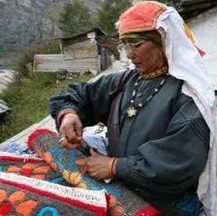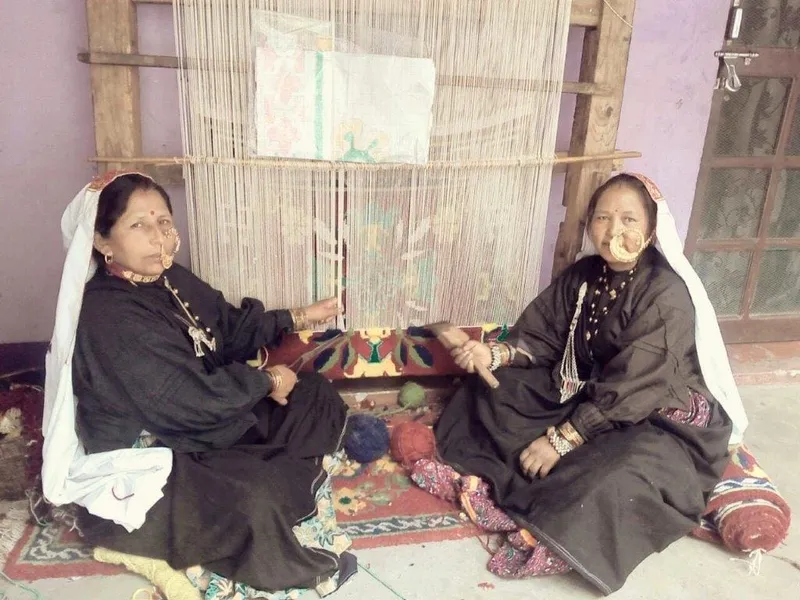 Every year, the nomadic Bhotiya weavers spend the winter months in Dunda in weaving their clothes and the summer months in selling those clothes in different seasonal fairs and tourism sites of Uttarakhand or harvesting fields in Harsil. While in Dunda of the Uttarkashi district, they weave gorgeous traditional patterns on their crude upright or pit looms, using Charkha-spun wools. Traditionally, the Bhotiya weavers rear their own sheep for wool in the grazing plains of Harsil. In the winter, when the sheep grow fat and have fully gown hair, the Bhotiyas come down to Dunda to begin their weaving activities. The Dunda weaving cluster in Uttarakhand is famous for the carpets and pashmina shawls made by the Bhotiya weavers.