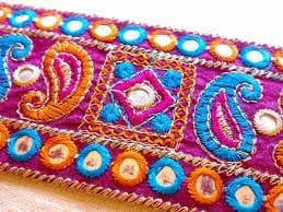 Embroidery designs are prepared by fixing small round shaped mirrors to the material with the help of the buttonhole stitch,the outline being sketched by hand.Silken thread is used for the stitching done in stem or herringbone,closely worked.Flowers and creepers are patterned against a dark background.