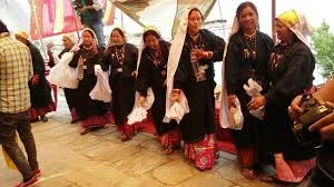 Traditional female costumes of Bhotia Tribe Females of Bhotia tribe mainly wore Honju, Chhua andPangdin as their traditional garments Costume of Bhotia community shows influence of both Bhotia and Tibetan culture. Bhotia people weave their personal apparels at their home itself. Other Female costume mainly includes ghagra (coloured gathered skirt), ghunghati (white head gear with brocade patch), chuba (long sleeved woollen coat up to ankle).