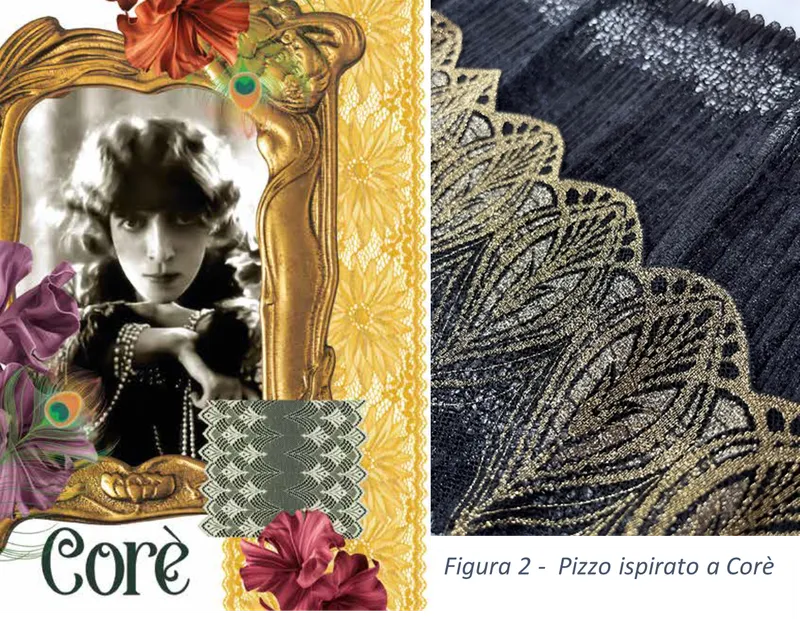 Corè Luisa Amman, born in the late 19th century into a wealthy bourgeois family, married at a young age and became Marchesa Casati. "Corè" is the endearing nickname given to her by her lover Gabriele D'Annunzio, inspired by Kore, the Queen of the Underworld. She was a patron of the arts, an eccentric and transgressive collector. This theme celebrates opulence, from peacock feathers to Liberty-style designs in deep colours and warm metallic glimmers. An innovative proposal for the theme is the pleating technique, achieved directly in the weaving process of the Ultralight jacquardtronic laces.