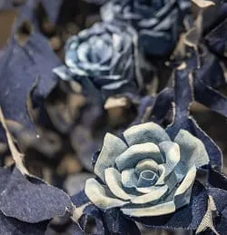 A hanging trellis with flowers, leaves, vines, wisteria and chrysanthemums welcomes visitors, but it is no ordinary flora but a dense structure that blooms in blue, indigo blue. Each piece cut from jeans and denim.