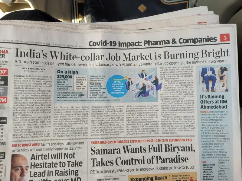 Unlike previous years there are good changes in work culture in all the organizations right from the Top to Bottom. Earlier days the physical presence of everyone including C- Suite executives was must in the working places. Now the white collared Babus and C- Suite Executives are allowed to work from home thus saving huge time and economy. The serving & Marketing personnel may opt for work from home. All will take shape as per the nature of the jobs. There are the higher scopes for the white-Collar job market (see fig 1) TOI, 10.02.22 for the higher turnover.