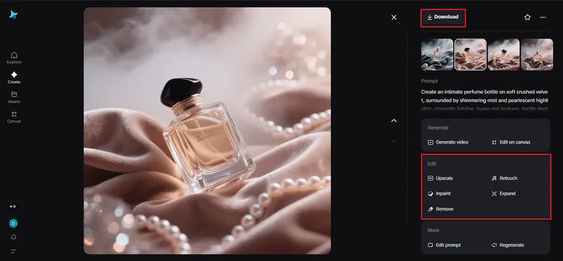 Once your tactile illusion is complete, you'll want to finish it with Dreamina's tools. Inpaint the tactile illusion to improve texture details, expand to include the texture in a larger scene, remove to eliminate visual clutter, and you may want to retouch to darken highlights and/or deepen shadows for dimension and feel. After that, click Download to retrieve your artwork. What you'll have is not only a design—the tactile illusion piece is a digital artifact that fools the skin through the eyes!