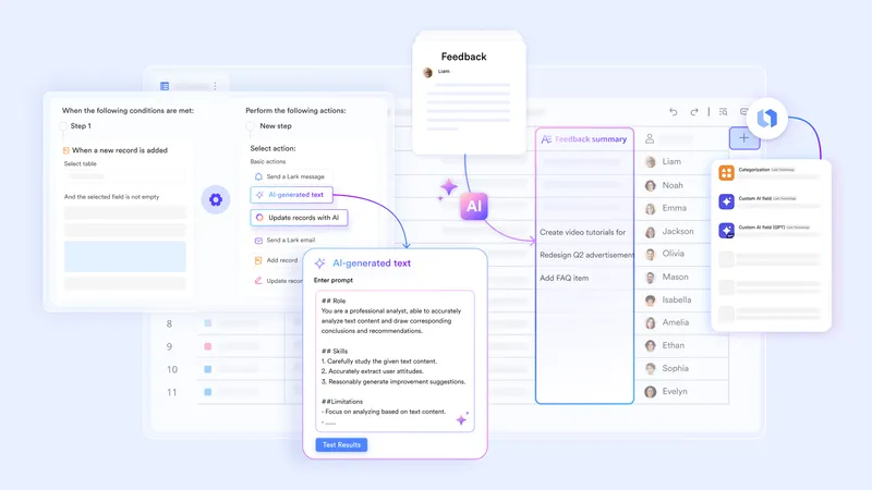 - Relational records with people fields and date pickers. Lark Base allows teams to build operational databases with the field types that project tracking actually requires: assignee fields that pull from the team directory, date pickers for deadlines, and dropdown menus for status. These fields make the database self-documenting in a way that a spreadsheet with typed text never can be.