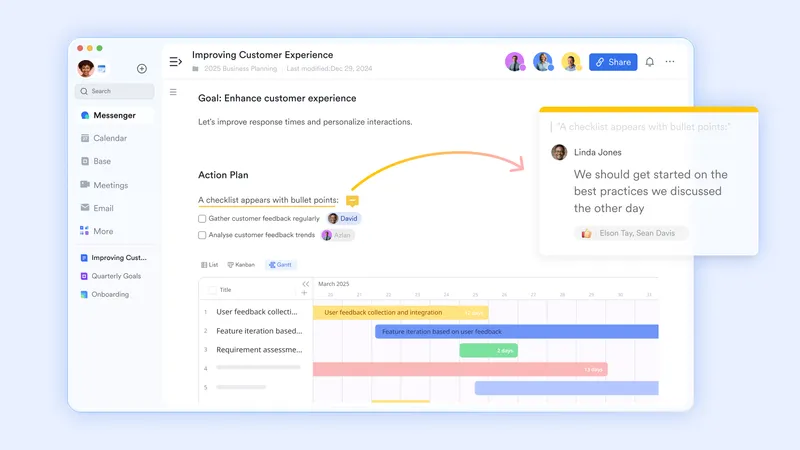 - "@mention" for in-document task assignment. Any team member mentioned in a Lark Docs receives an immediate notification and can respond directly from within the document. Ownership of actions is established at the point of writing rather than communicated separately in a task tool.